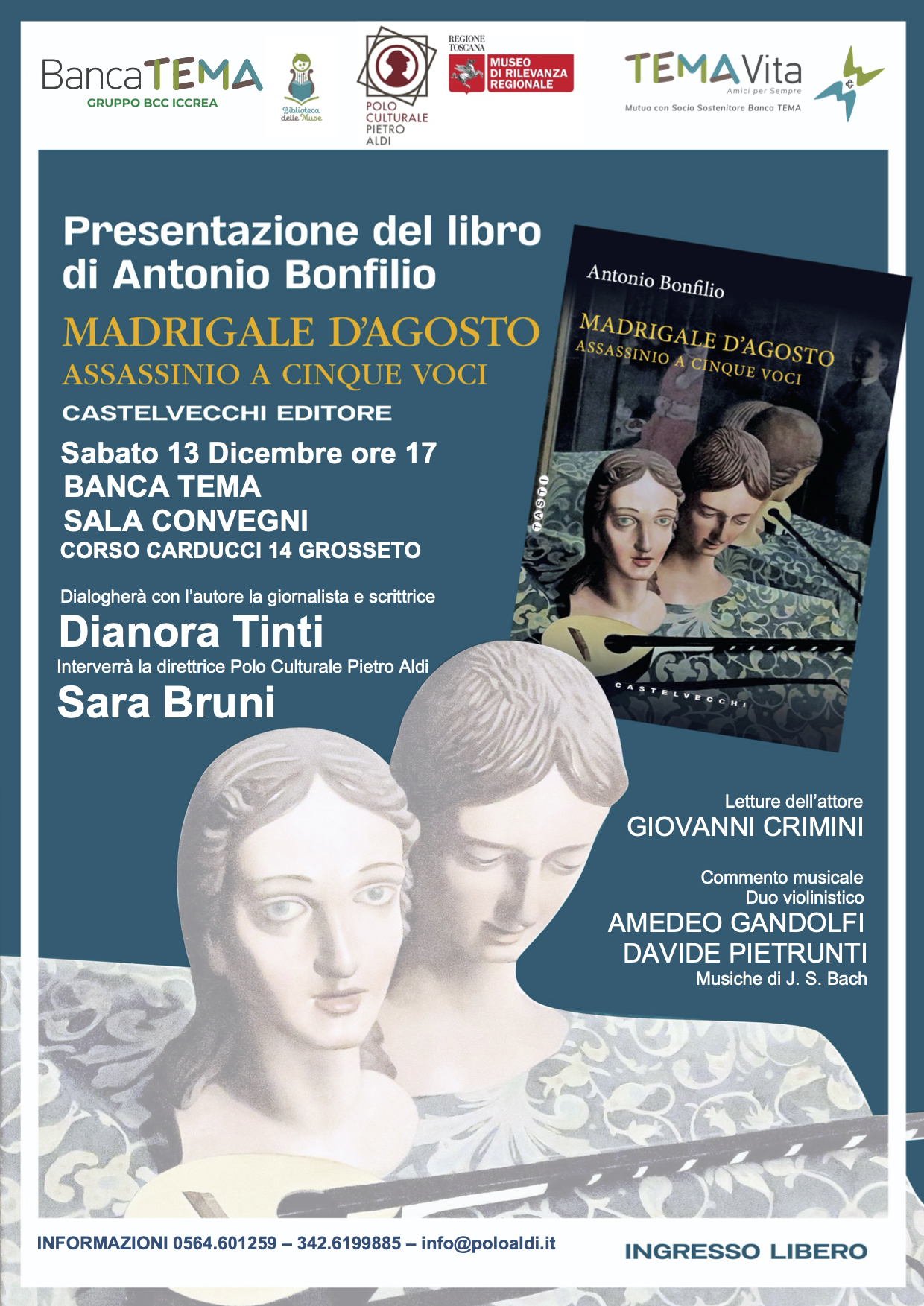 Sabato 13 dicembre alle ore 17:00, nella sala convegni della sede di Banca Tema in Corso Carducci, 14 a Grosseto, sarà presentato il romanzo d’esordio di Antonio Bonfilio, intitolato “Madrigale d’agosto – Assassinio a cinque voci” (Castelvecchi Editore). L'ingresso è libero.