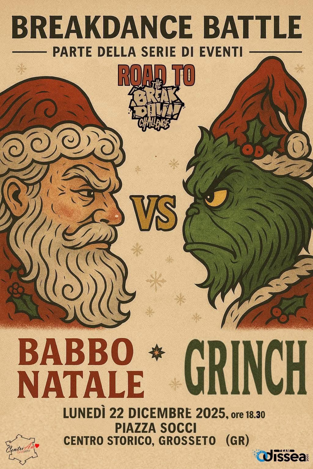 L’evento, parte della serie ROAD TO THE BREAKDOWN CHALLENGE, il grande appuntamento mondiale di breaking che tornerà nel capoluogo il 20 e 21 giugno, trasformerà le vie del centro in un palcoscenico magico. Già dalle ore 18:00, Babbo Natale e il Grinch invaderanno le strade, radunando i propri seguaci e accendendo l’atmosfera.