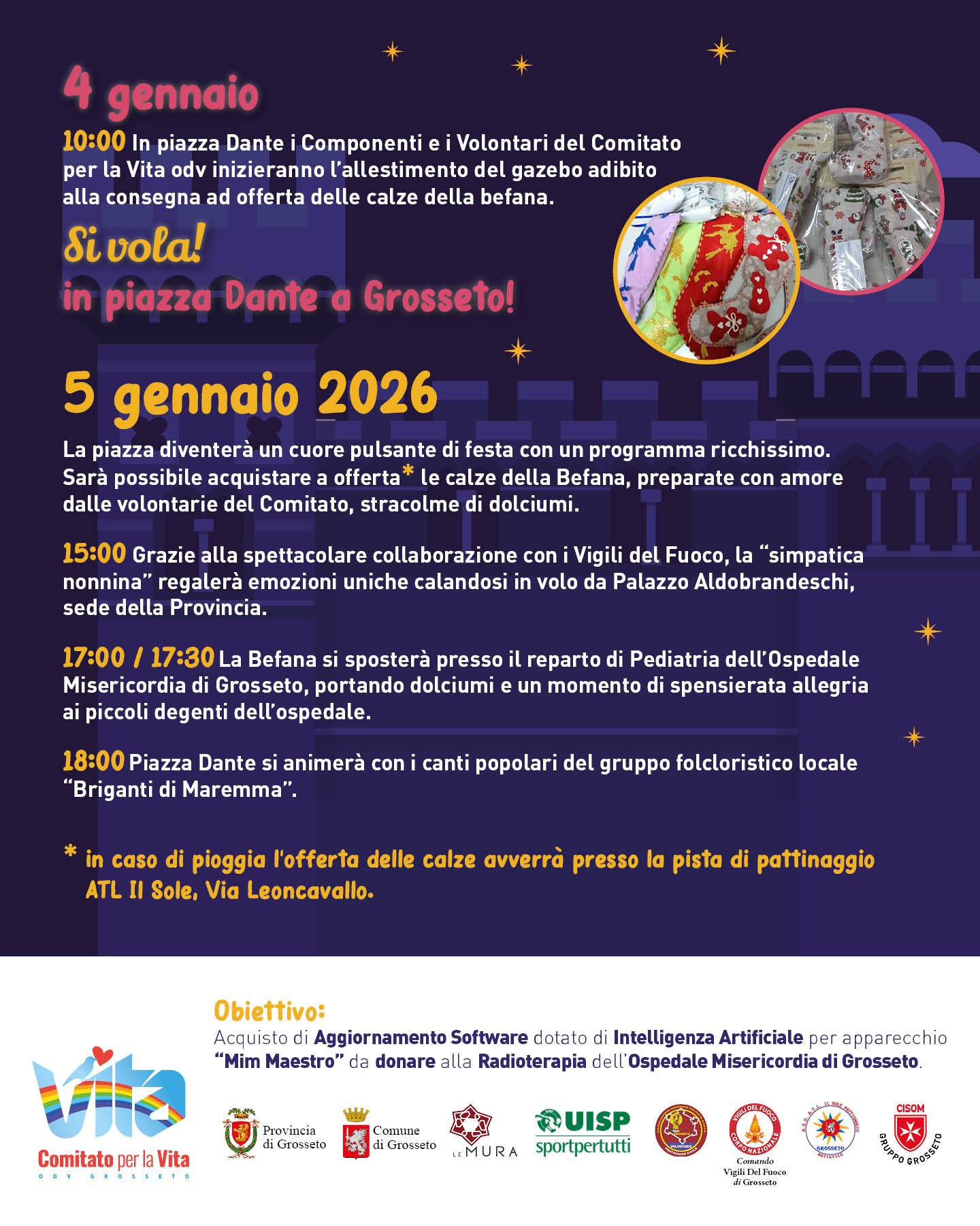 L’evento, ormai storico per la città, unisce intrattenimento e beneficenza con un obiettivo preciso: sostenere l’ospedale Misericordia di Grosseto attraverso la raccolta fondi legata alle calze della Befana.