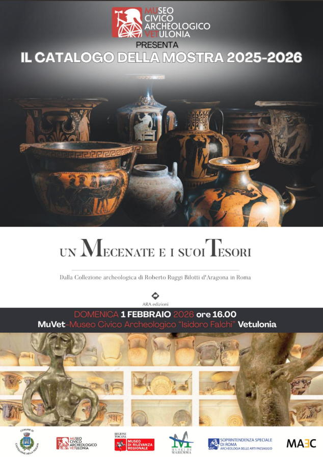 Nell’ambito del secondo appuntamento della Festa dei Musei di Maremma, domenica 1° febbraio alle ore 16.00 il MuVet - Museo Civico Archeologico Isidoro Falchi di Vetulonia - ospiterà la presentazione del catalogo della mostra “Un mecenate e i suoi tesori. La Collezione archeologica di Roberto Bilotti Ruggi d’Aragona in Roma”. L’iniziativa è promossa dall’Amministrazione comunale di Castiglione della Pescaia insieme alla Direzione scientifica del museo e rappresenta uno dei momenti centrali del programma culturale invernale.