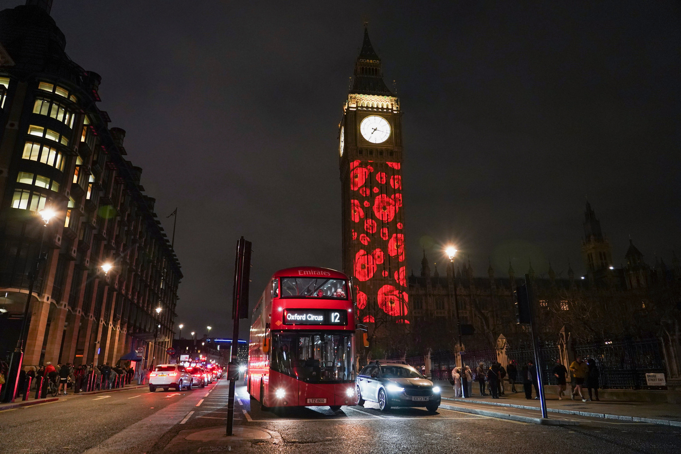 Londra, Papaveri rossi sul Big Ben per i caduti in guerra (foto LaPresse)