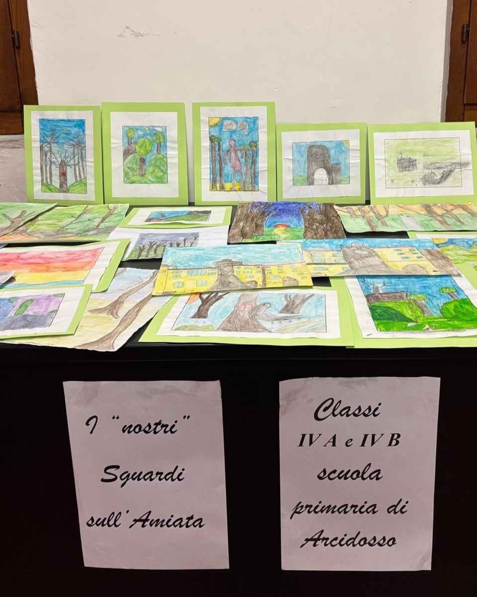 Accanto alle opere, ci sono anche i disegni realizzati dai bambini delle classi quarte della scuola primaria di Arcidosso.