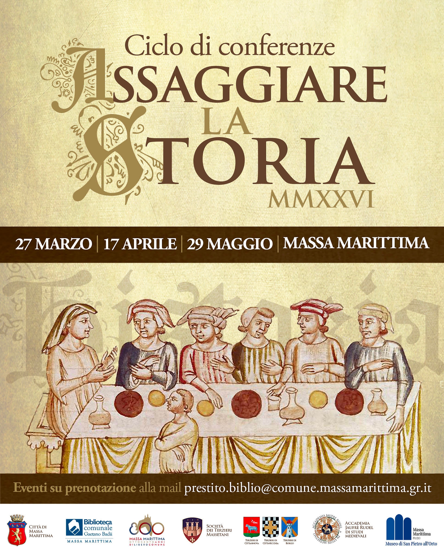 Il percorso prosegue venerdì 17 aprile, sempre in Biblioteca, con un tema dal fascino magnetico: la salute e le epidemie nel Trecento. Il dottor Fabio Cavalli ci riporterà nella Massa Marittima dell’epoca per capire come medici e cittadini affrontavano i mali del tempo. A stemperare la serietà dell'argomento ci penserà il Terziere di Borgo, che delizierà i presenti con i profumi dello zafferano nella torta di cipolle e con la delicatezza della torta di ceci e mandorle, seguendo i precetti del celebre Maestro Martino da Como.