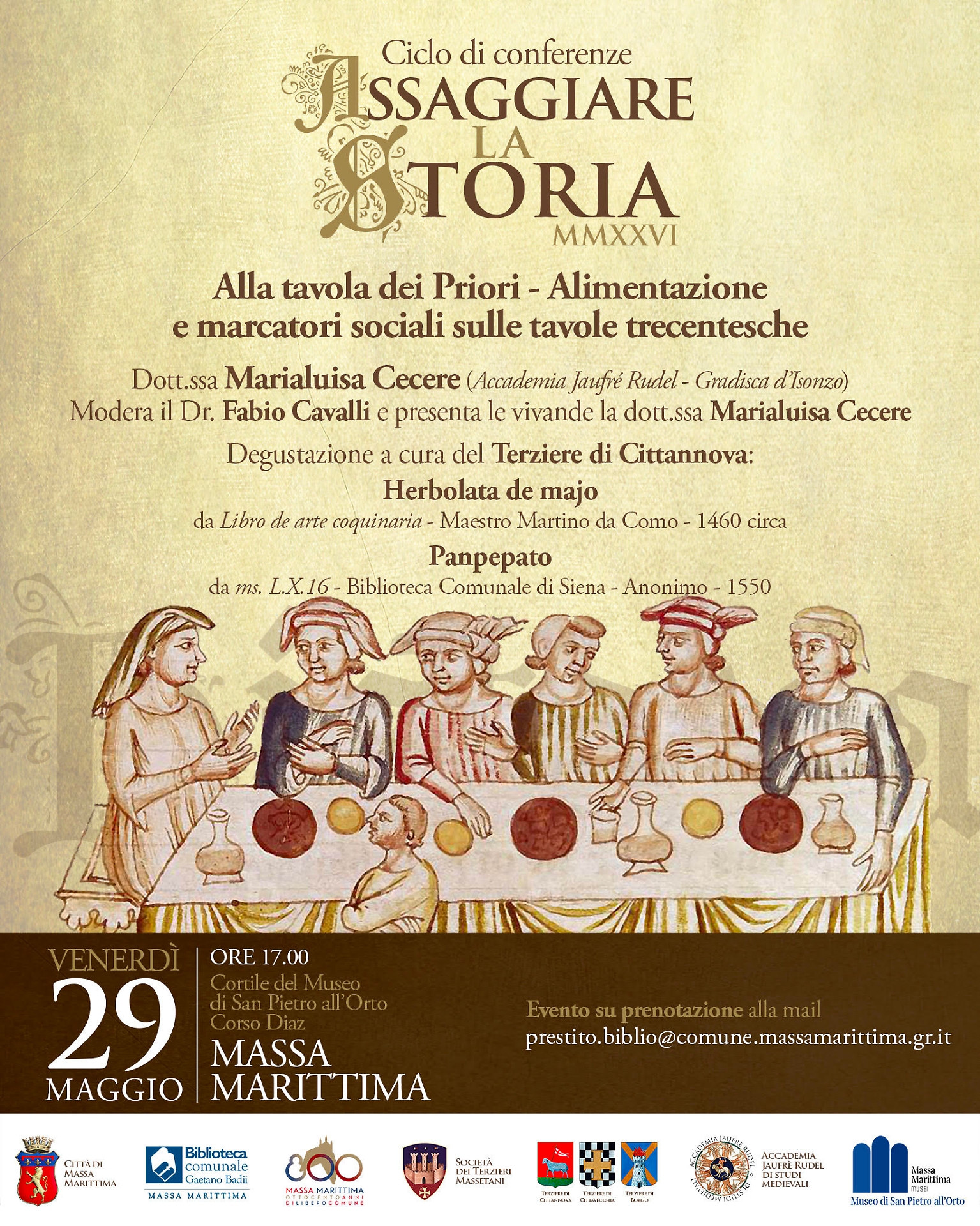 Il gran finale di questa anteprima primaverile è previsto per venerdì 29 maggio nella suggestiva cornice del Cortile del Museo di San Pietro all’Orto. La dottoressa Marialuisa Cecere ci svelerà i segreti della "Tavola dei Priori", spiegando come il cibo fosse un vero e proprio simbolo di potere sociale nel XIV secolo. Per l'occasione, il Terziere di Cittannova servirà l’Herbolata de majo, un'esplosione di erbe primaverili, concludendo in dolcezza con l’antico panpepato, seguendo un manoscritto senese del 1550.