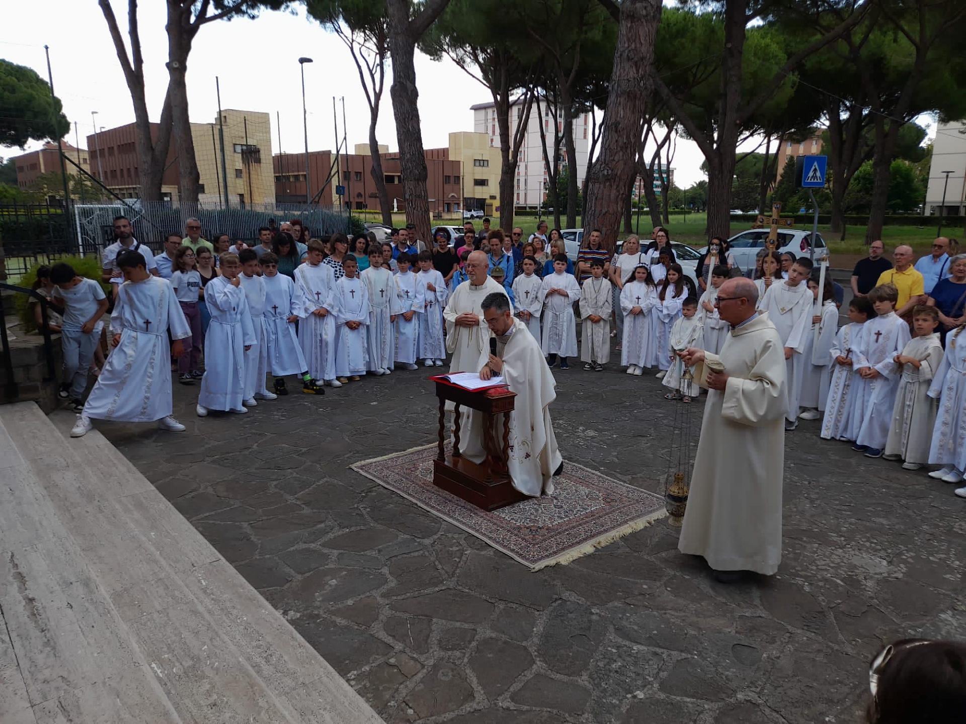 Don Marco gentile durante una cerimonia davanti alla parrocchia
