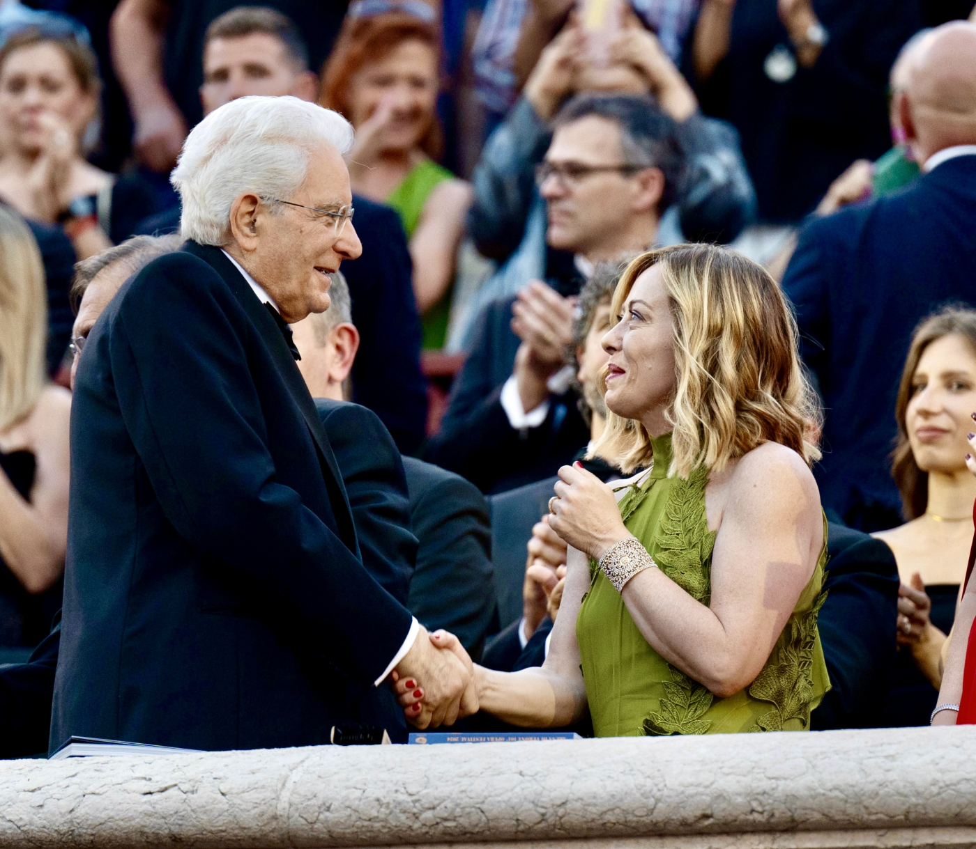La premier Meloni e il presidente Mattarella in uno spettacolo del 2024 all'Arena