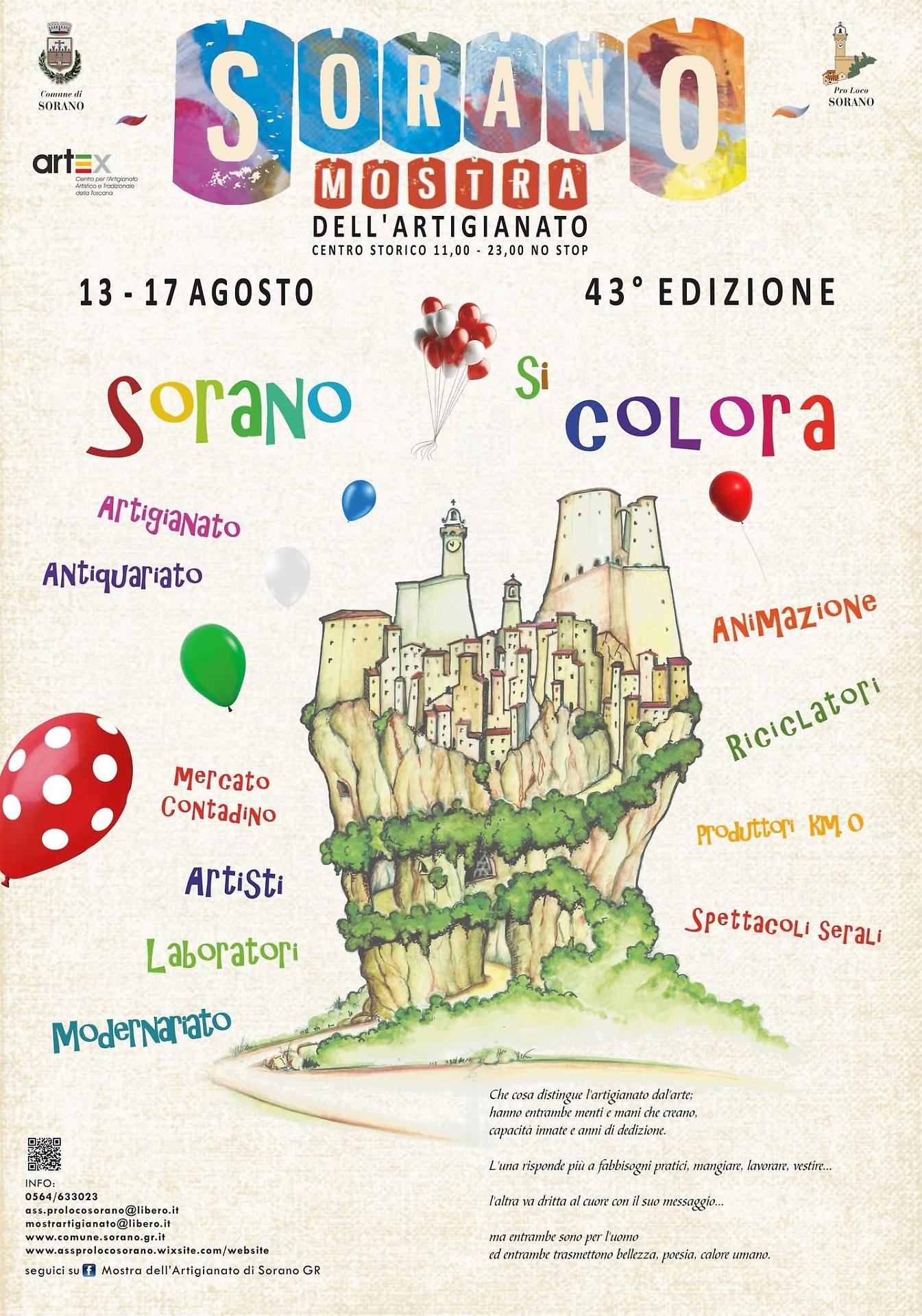 Fino ad oggi, domenica 17 agosto, a Sorano si tiene la 43ª Mostra dell’Artigianato, un’iniziativa unica, capace di unire tradizione, comunità e solidarietà. Oltre alle bancarelle sparse per il borgo, in piazza della Chiesa è allestito un mercatino solidale organizzato dai bambini, che hanno deciso di impegnarsi in prima persona per aiutare Riccardo, un bambino di 4 anni di Pitigliano affetto da una rara sindrome genetica.