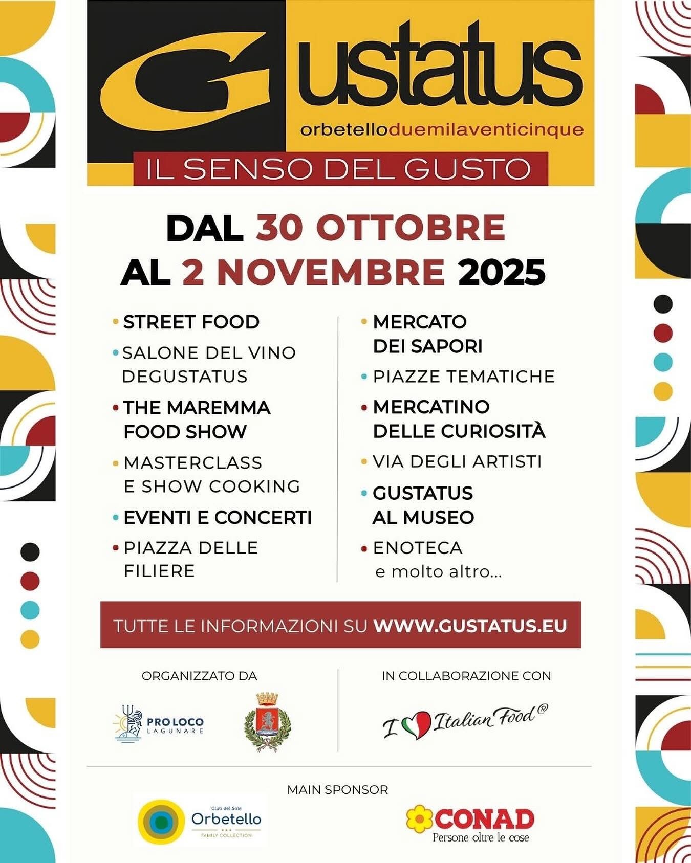 Il programma. Giovedì 30 ottobre: inaugurazione ufficiale in pazza Duomo con il corteo storico dei Reali Presidi e la rievocazione del Centro storico culturale Duca d’Arcos. Esibizione del celebre bartender Bruno Vanzan, seguita da spettacoli e concerti itineranti nelle piazze principali, tra cui, alle 18.30, l'esibizione del Corpo bandistico città di Orbetello. Venerdì 31 ottobre: parate itineranti, spettacoli di strada e acrobazie aeree. In serata, musica live nelle piazze principali. Sabato 1 novembre: la tradizionale Corsa dei Barchini nella laguna (batterie al mattino e finali nel pomeriggio). La conferenza “Raccontare il passato per capire il presente”, con ospiti d’eccezione tra cui Giuliano Amato. Gran finale musicale con Nesli e Petit in piazza Eroe dei due mondi, concerto organizzato con la collaborazione di Lux Events Italia. Domenica 2 novembre: giornata dedicata allo sport con The Big One, gara di pesca in kayak, spettacoli per famiglie e la grande parata degli Sbandieratori dei Sette Rioni di Carpineto. Alle ore 15, alla città di Cosa, la conferenza “L'agro Cosanus, terra di vino. "Cosa" e come si mangiava e beveva 2000 anni fa” a cura dell’Archeologo Claudio Calastri. La giornata si chiude nel centro storico con la musica delle esibizioni live in diverse piazze del centro. Ritornano a grande richiesta anche la Via degli Artisti a cura dell' Associazione Art Corrente Alternata e Filippo Muneghina e gli appuntamenti di Gustatus al Museo Archeologico Guzman. Come da tradizione, Gustatus coinciderà con il weekend di Halloween, portando in centro spettacoli comici, giochi e installazioni itineranti per i più piccoli. Non mancheranno l’area giochi e spettacoli per i bambini nei Giardini chiusi oltre alle attività sportive all’aria aperta, come l’Orbetello Kayak Experience, che offrirà sessioni gratuite di navigazione nella Laguna di Ponente.