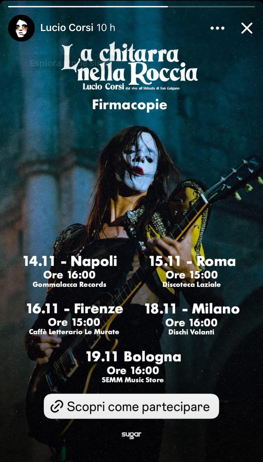 I fan interessati a partecipare agli eventi potranno trovare tutte le informazioni necessarie sul sito ufficiale dell’artista: https://luciocorsi.com/la-chitarra-nella-roccia-firmacopie.