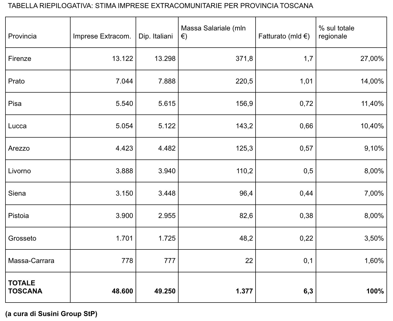 Le imprese a conduzione extracomunitaria sono diventate una componente strutturale dell’economia toscana, con 48.600 aziende, 49.250 dipendenti italiani, una massa salariale di 1.377 milioni e un fatturato di 6,3 miliardi di euro secondo la stima di Susini Group StP. A livello nazionale le imprese extracomunitarie sono 540mila, impiegano tra 500mila e 550mila lavoratori italiani e generano 70 miliardi di euro di fatturato, pari a circa il 7,2% del totale delle aziende presenti in Italia.