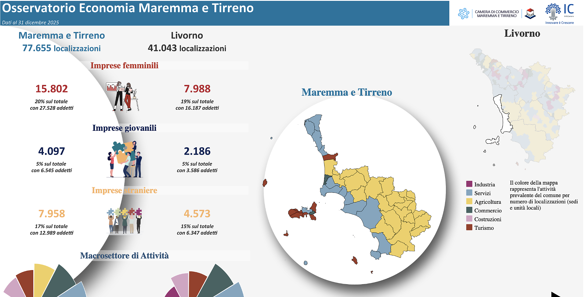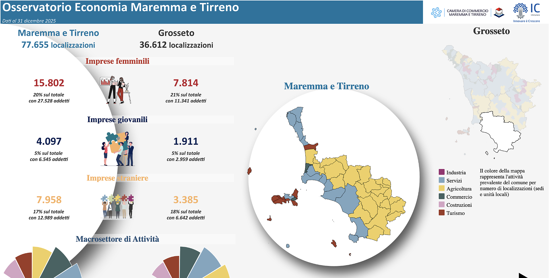 Per chi desideri approfondire ulteriormente l'analisi economica della regione, la Camera ricorda che sul proprio sito è disponibile l'Osservatorio Economia Maremma e Tirreno, un portale digitale interattivo che offre dati aggiornati su struttura produttiva, demografia d'impresa ed economia delle province di Grosseto e Livorno. Uno strumento utile per amministratori, imprenditori, addetti ai lavori e chiunque voglia comprendere le dinamiche economiche territoriali nel dettaglio.