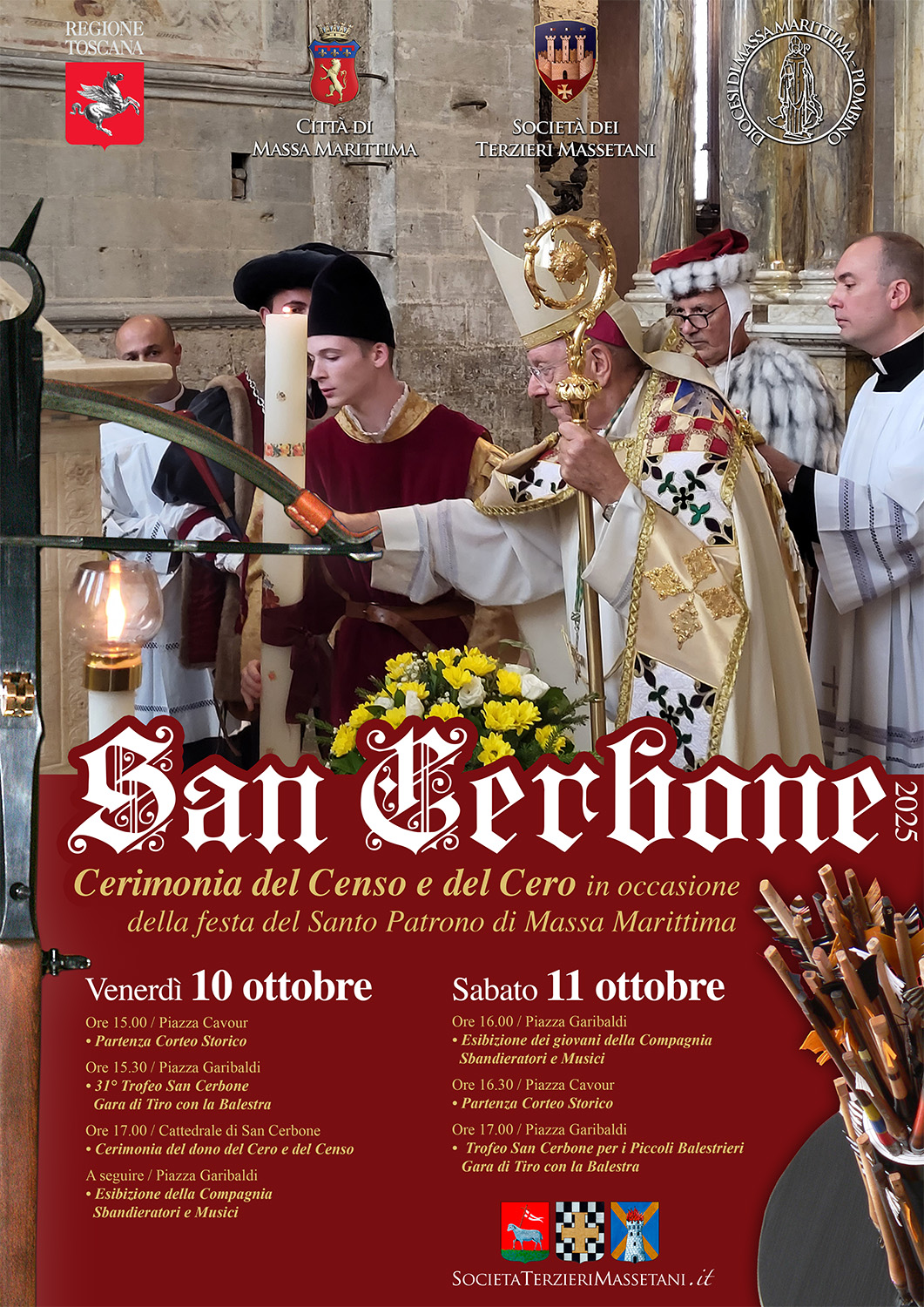 Due giorni di festa a Massa Marittima in onore del patrono San Cerbone, un’occasione per celebrare la storia secolare della città tra sacralità e folclore. Si comincia venerdì 10 ottobre, alle ore 15, in piazza Cavour, con il corteo storico per poi spostarsi in piazza Garibaldi, dove alle 15 e 30 si svolgerà la gara di tiro con la balestra del 31° Trofeo San Cerbone.