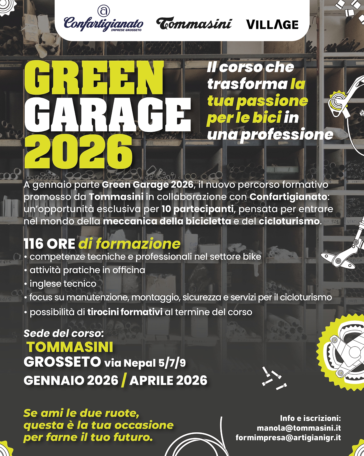 “Abbiamo scelto di avviare questo percorso formativo – commenta Giulia Pulcini, responsabile del progetto per Confartigianato Imprese Grosseto – perché crediamo fortemente nelle potenzialità professionali legate al mondo della bicicletta e del cicloturismo, due settori che stanno vivendo una crescita significativa. La collaborazione con Tommasini Village, azienda associata a Confartigianato e punto di riferimento internazionale per la qualità artigianale delle sue biciclette, nasce dalla volontà comune di valorizzare competenze tecniche altamente specializzate e creare nuove opportunità di lavoro per i giovani e per chi desidera reinventarsi. Green Garage 2026 forma figure richieste dalle imprese, capaci di inserirsi in officine, negozi specializzati, aziende del cicloturismo e in tutto quel comparto che ruota attorno alla mobilità sostenibile. È un progetto che contribuisce allo sviluppo del territorio unendo formazione, tradizione artigiana e innovazione”.