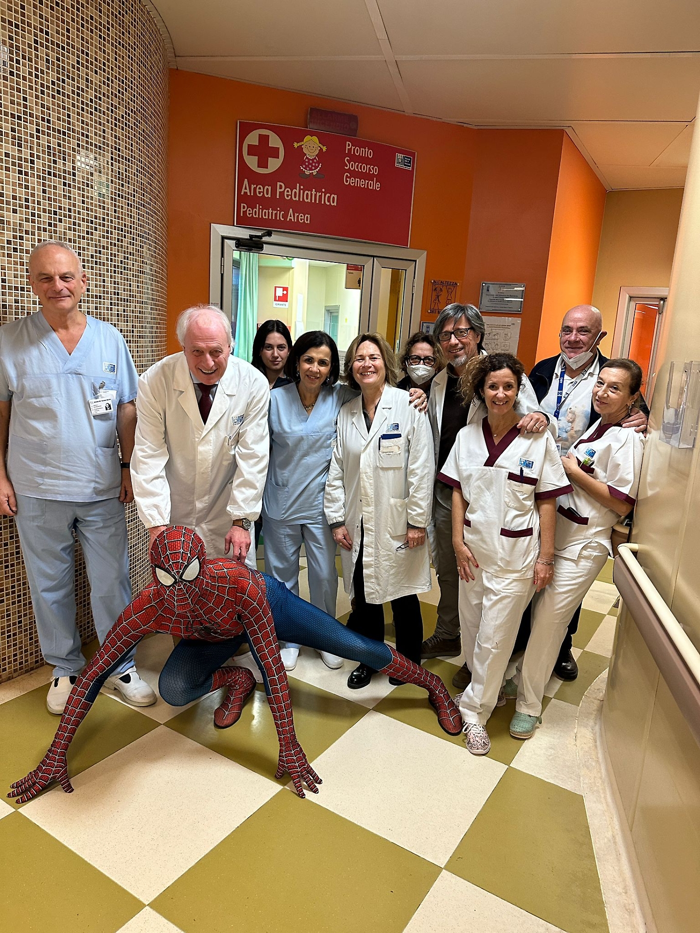 Il supereroe ha fatto visita nel reparto, negli ambulatori e al Pronto soccorso pediatrico e si è intrattenuto con i piccoli pazienti scambiando battute e prestandosi a fotografie ricordo.