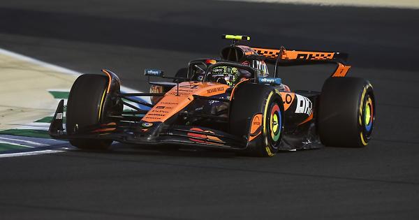 ROMA (ITALPRESS) - Lando Norris fa segnare il miglior crono in 1:28.267 nella seconda sessione delle prove libere del Gran Premio di Arabia Saudita 2025, valido per il Mondiale di Formula 1. Il pilota britannico della McLaren precede il compagno di squadra Oscar Piastri di 163 millesimi e la Red Bull dell'iridato in carica Max Verstappen di 280 millesimi. Quarto tempo per Charles Leclerc, su Ferrari, che ha un ritardo di quasi mezzo secondo dal leader del Mondiale; mentre con l'altra Rossa Lewis Hamilton chiude soltanto in tredicesima piazza. Ottima prova delle due Williams, con Carlos Sainz che si issa fino al quinto posto ed Alexander Albon che ottiene il decimo tempo, davanti alla Mercedes di Kimi Antonelli. - foto Ipa Agency - (ITALPRESS). xq6/pdm/red 18-Apr-25 20:21