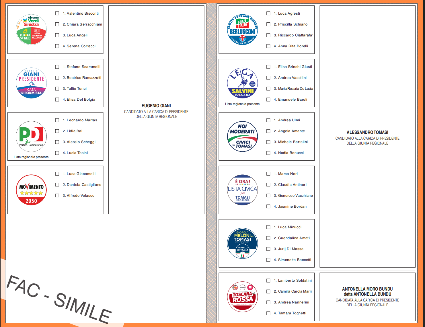 Domenica 12 ottobre (dalle 7 alle 23) e lunedì 13 ottobre (dalle 7 alle 15) si vota per eleggere il presidente della Regione Toscana e il nuovo Consiglio regionale. Per la carica di presidente si sfidano – in ordine alfabetico – Antonella Bundu (ex consigliera comunale di Firenze, candidata con “Toscana Rossa”), Eugenio Giani (presidente in carica, sostenuto dal centrosinistra, dal Movimento 5 Stelle e della lista civica Casa Riformista) e Alessandro Tomasi (sindaco di Pistoia di Fratelli d’Italia, sostenuto da tutti i partiti del centrodestra).