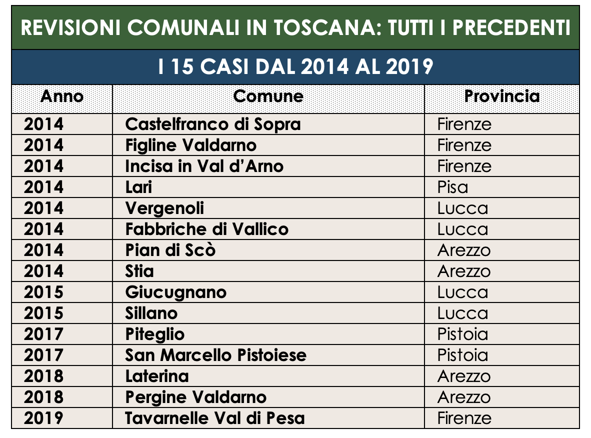 "Nel dettaglio, nel 2014 sono stati modificati i confini comunali o avviati processi di fusione in diverse realtà: Castelfranco di Sopra, in provincia di Firenze, Pian di Sio e Fabbriche di Vallico, entrambe in provincia di Lucca, così come Vergenoli; nello stesso anno sono stati interessati anche Figline Valdarno e Incisa in Val d’Arno, in provincia di Firenze, oltre a Lari, in provincia di Pisa, e Stia, in provincia di Arezzo. Nel 2015 il percorso è proseguito con Giucugnano e Sillano, entrambi in provincia di Lucca. Nel 2017 sono stati coinvolti due comuni della provincia di Pistoia, Piteglio e San Marcello Pistoiese, mentre nel 2018 le modifiche hanno riguardato Laterina e Pergine Valdarno, entrambe in provincia di Arezzo. Infine, nel 2019, è stato il turno di Tavarnelle Val di Pesa, in provincia di Firenze. Un quadro ricco, che mostra come, in soli cinque anni, la Regione Toscana abbia più volte messo mano all’assetto amministrativo locale, recependo richieste, consultazioni e processi partecipativi che hanno portato alla nascita di nuovi comuni o alla riorganizzazione dei precedenti".