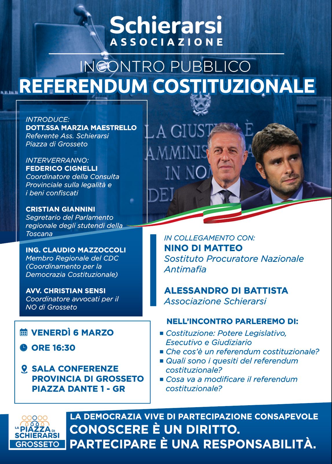 "Conoscere è un diritto, partecipare è una responsabilità". Con questo invito alla cittadinanza, l’Associazione Schierarsi organizza un importante incontro pubblico dedicato al prossimo Referendum Costituzionale. L’appuntamento è fissato per venerdì 6 marzo alle ore 16:30 presso la Sala Conferenze della Provincia di Grosseto, in Piazza Dante.