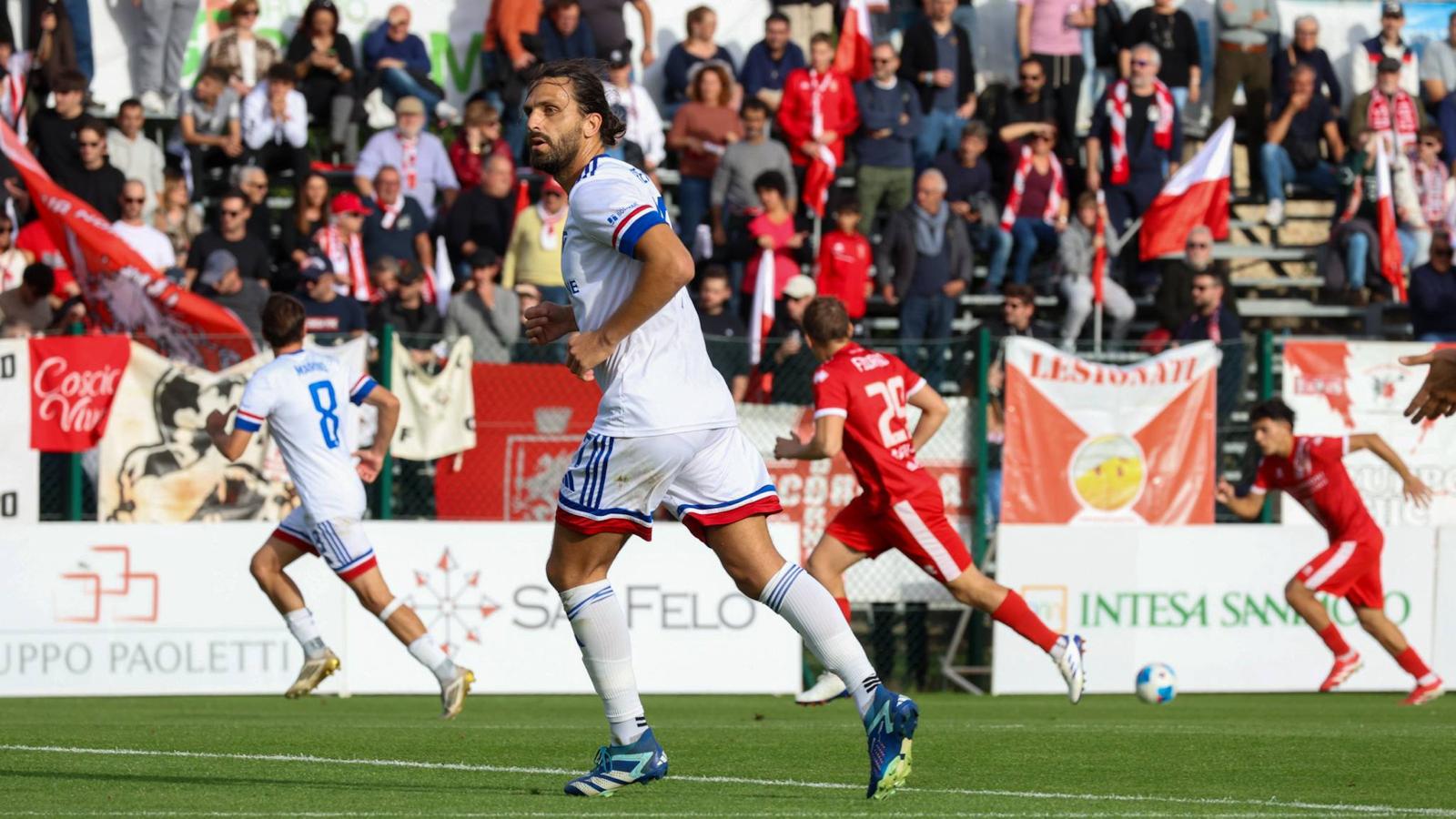 Al 28’ arriva il vantaggio degli ospiti: Sabelli di testa impatta sul calcio d’angolo battuto da Disanto e porta il punteggio sul 2-3. Alla mezz’ora Marzierli si invola verso la porta e calcia, Pacini con i piedi gli nega la tripletta personale. Al 38’ Maltoni la mette dentro di testa sul cross di Lo Sicco, l’arbitro annulla per fuorigioco. E al 42’ Sabelli con un destro dall’interno dell’area chiude l’incontro, segnando il quarto gol per il Grosseto. Al termine dei 5’ di recupero concessi dall’arbitro il match termina così sul 2-4 per il Grosseto.