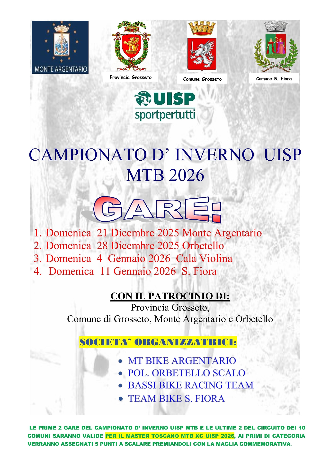 Le competizioni si svolgeranno domenica 21 dicembre a Monte Argentario, domenica 28 dicembre a Orbetello, domenica 4 gennaio a Cala Violina e domenica 11 gennaio a Santa Fiora. Il circuito attribuisce punteggi validi anche per il master toscano MTB XC Uisp 2026, con una maglia celebrativa riservata ai migliori concorrenti di ogni categoria. Come nelle precedenti edizioni, le tappe di Monte Argentario e Orbetello rientrano anche nel master toscano Uisp di mountain bike cross country, insieme al Trofeo 10 Comuni.