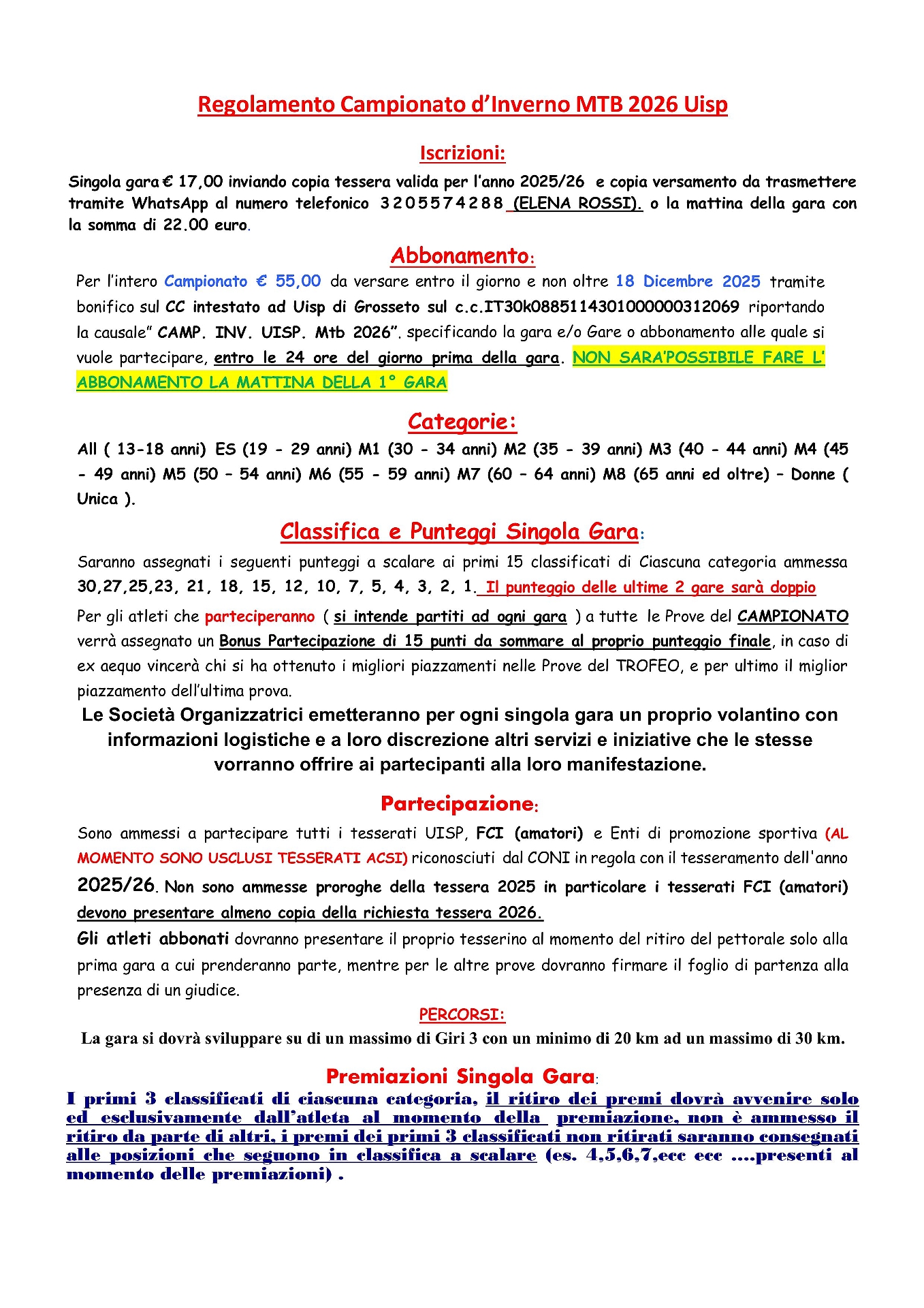 L’iscrizione alla singola prova ha un costo di 17 euro con invio anticipato della tessera valida 2025/26 e della ricevuta di pagamento, oppure 22 euro se il versamento viene effettuato direttamente la mattina dell’evento. È possibile sottoscrivere anche un abbonamento all’intero circuito al prezzo di 55 euro, da pagare entro il 18 dicembre 2025 tramite bonifico intestato a Uisp Grosseto, indicando nella causale “Campionato invernale MTB 2026” e specificando le gare scelte; l’abbonamento non potrà essere acquistato il giorno della prima tappa.