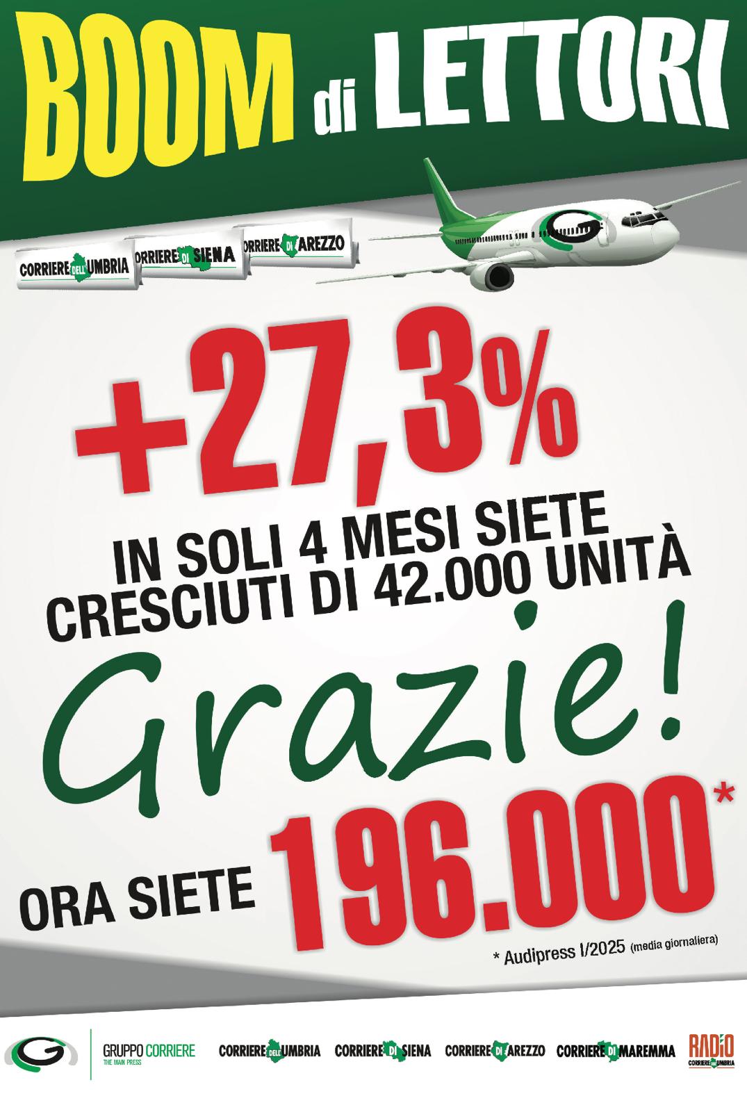In un’Italia editoriale che spesso sembra schiantarsi in picchiata tra tante fake news, social urlati e qualche quotidiano ancora piegato dalle abitudini digitali, noi siamo decollati. E state facendo decollare anche noi del Gruppo Corriere. Il Corriere in edicola, in particolare, proprio grazie a voi, vola sempre più in alto. Anzi, i Corrieri: quello dell’Umbria, di Arezzo e di Siena. Che con il Corriere di Maremma sul web e Radio Corriere dell’Umbria, sul Dab, costituiscono – insieme a mensili e supplementi, questo nostro gruppo editoriali.
