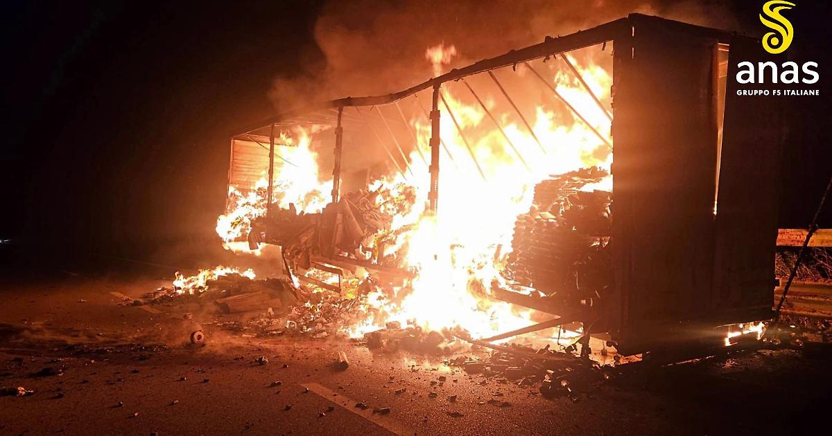 Mezzo pesante in fiamme sull'A19, illeso il conducente
