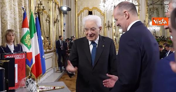 Il Presidente della Repubblica Sergio Mattarella incontra in Quirinale Milan e Bologna, le due squadre finaliste della Coppa Italia, che lo omaggiano regalandogli delle maglie. / Quirinale