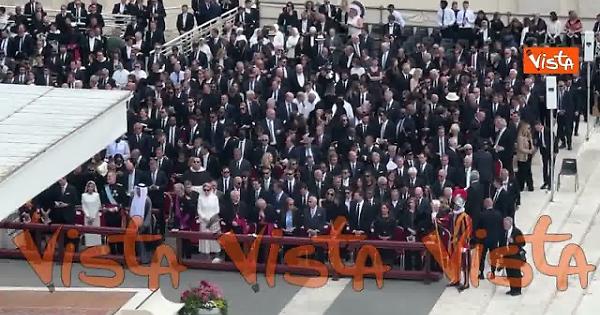 Il segno della pace tra Von der Leyen e Regina Letizia di Spagna alla messa di insediamento del Papa
