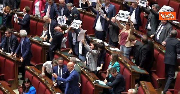 Bagarre nell'Aula della Camera prima del via libera al decreto sicurezza. Dai banchi delle opposizioni sono stati sollevati cartelli sui quali si legge: "Ne' liberi ne' sicuri", "Non si arresta la protesta", "La democrazia non si piega", "Decreto paura".