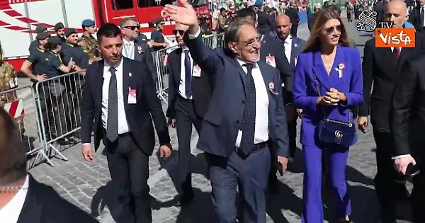 La folla applaude al Presidente del Senato Ignazio La Russa al suo arrivo ai Fori Imperiali per la tradizionale parata del 2 Giugno, lui fa il gesto della vittoria con le dita, qualcuno grida: "Ciao Ignazio!"