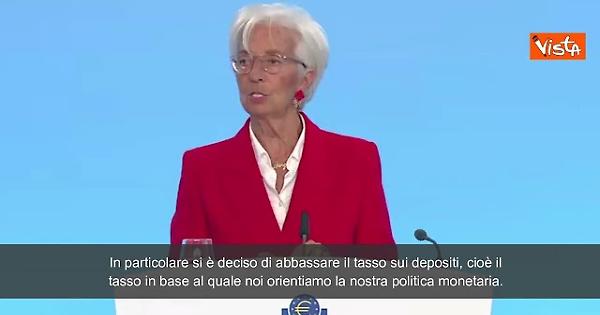 "Il Consiglio Direttivo della Bce ha deciso oggi di abbassare i tre tassi di interesse chiave di 25 punti base. In particolare si è deciso di abbassare il tasso sui depositi, cioè il tasso in base al quale noi orientiamo la nostra politica monetaria. La decisione si basa sulla valutazione aggiornata delle prospettive dell'inflazione, le dinamiche dell'inflazione e la forza della trasmissione della politica monetaria" così la presidente della Banca Centrale Europea Christine Lagarde durante una conferenza stampa.