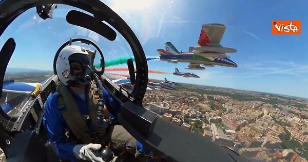 Il volo delle Frecce Tricolori sui fori Imperiali per la parata del 2 Giugno visto dalla prospettiva del pilota.