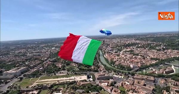 L'esibizione dei paracadutisti su Via dei Fori Imperiali alla parata del 2 Giugno vista dall'elicottero.