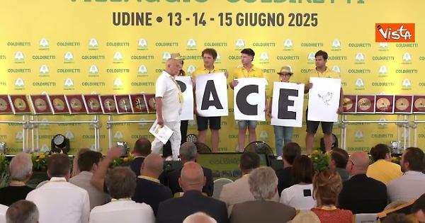 (Agenzia Vista) Roma, 13 giugno 2025 Alla cerimonia degli Oscar Green a Udine, i giovani della Coldiretti hanno aperto con un flash mob per la pace, esponendo cartelli con la scritta "pace" e una colomba. L'iniziativa ha lanciato un appello contro l’escalation del conflitto tra Israele e Iran. Un invito a scegliere la diplomazia per evitare gravi rischi militari e commerciali. Presente anche il segretario Gesmundo. Fonte: Agenzia Vista / Alexander Jakhnagiev