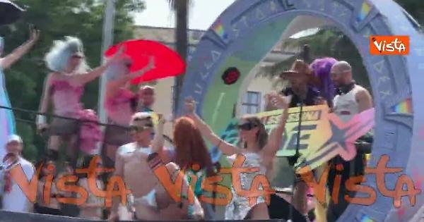 La madrina del Roma Pride 2025 Rose Villain arriva al corteo sul carro di Muccassassina, celebre locale gay della città. La cantante sventola la bandiera palestinese.