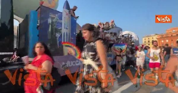 (Agenzia Vista) Roma, 15 giugno 2025 Si è tenuto a Roma, per le vie del centro l'annuale Roma Pride. Migliaia di persone sono scese in piazza seguendo i diversi carri. Ecco il passaggio del corteo nei pressi del Colosseo. Tra i carri che sono passagti anche quello del Muccassassina, abbellita da un mappamondo e da un missile. Fonte: Agenzia Vista / Alexander Jakhnagiev