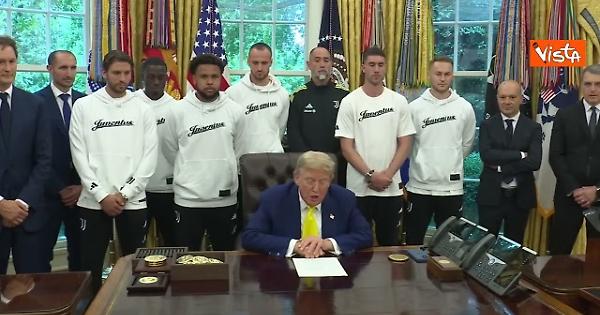 Il Presidente Usa Donald Trump riceve la squadra della Juventus alla Casa Bianca. C'è anche l'ex giocatore della Nazionale italiana Chiellini.