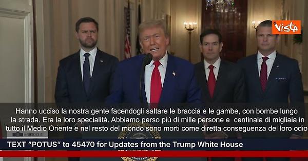 "Pochi minuti fa fa l'esercito Usa ha effettuato massicci attacchi di precisione sui tre principali impianti nucleari del regime iraniano nei pressi di Natanz ed Esfahan. Tutti hanno sentito questi nomi per anni, mentre si costruivano questi impianti orribilmente distruttivi. Il nostro obiettivo era la distruzione della capacità di arricchimento nucleare dell'Iran e lo stop alla minaccia nucleare posta dallo stato sponsor numero uno al mondo del terrorismo. Stasera posso riferire al mondo che gli attacchi sono stati un successo militare spettacolare. I principali impianti di arricchimento nucleare dell'Iran sono stati completamente e totalmente annientati. L'Iran deve ora fare la pace, altrimenti gli attacchi futuri saranno molto più devastanti. Da 40 anni l'Iran dice “morte all'America, morte a Israele”. Hanno ucciso la nostra gente facendogli saltare le braccia e le gambe, con bombe lungo la strada. Era la loro specialità. Abbiamo perso più di mille persone e centinaia di migliaia in tutto il Medio Oriente e nel resto del mondo sono morti come diretta conseguenza del loro odio. In particolare tanti sono stati uccisi da loro generale Qasem Soleimani, che ho deciso molto tempo fa di eliminare. Voglio ringraziare e congratularmi con il premier Bibi Netanyahu, abbiamo lavorato come una squadra, come forse nessuna squadra ha mai funzionato prima. C’è molta strada da fare per eliminare questa orribile minaccia contro Israele voglio ringraziare i militari israeliani per lo splendido lavoro che hanno fatto e soprattutto voglio congratularmi con i grandi patrioti americani che pilotavano quelle magnifiche macchine. Un'operazione del genere il mondo non l'ha mai vista per molti decenni e si spera, non ne avremo più bisogno. Voglio congratularmi con il Capo di Stato Maggiore Generale Dan Razin Caine e tutte le brillanti menti militari coinvolte. Adesso ci dovrà essere la pace o ci sarà una tragedia per l’Iran molto più grande di quella a cui avete assistito negli ultimi otto giorni. Ci sono molti obiettivi rimasti. L'operazione di stasera è stata la più difficile e forse la più letale, ma se la pace non arriva rapidamente noi inseguiremo gli altri obiettivi con precisione, velocità e abilità. La maggior parte di questi obiettivi possono essere aggiunti in pochi minuti. Domani il generale Kaine e il segretario Hegseth terranno una conferenza stampa. Grazie, Dio benedica Israele e Dio benedica l'America". Lo ha detto Donald Trump alla Casa Bianca dopo l'attacco contro l'Iran.