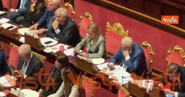 Meloni in Aula al Senato legge un biglietto, poi lo piega in due