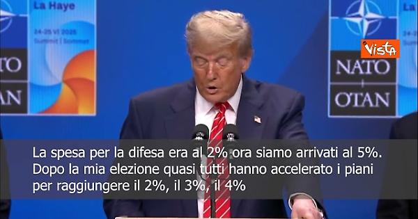 “Quando gli alleati raggiungeranno questa cifra, aggiungeranno più di 1 trilione di dollari all'anno. Pensate a quel trilione all'anno alla nostra difesa comune. E questo è davvero un monumento alla vittoria. Ma è una vittoria monumentale per gli Stati Uniti, perché davamo molto più di quanto ci spettasse, il che era piuttosto ingiusto, in realtà. Ma questa è una grande vittoria per l'Europa e per la civiltà occidentale in generale.” Così il Presidente degli Stati Uniti Donald Trump in una conferenza stampa al vertice Nato.