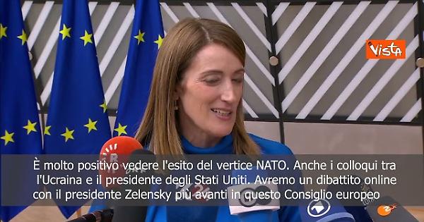 “È molto positivo vedere l'esito del vertice NATO. Anche i colloqui tra l'Ucraina e il presidente degli Stati Uniti. Avremo un dibattito online con il presidente Zelensky più avanti in questo Consiglio europeo.” Così la Presidente del Parlamento europeo Roberta Metsola a margine del Consiglio europeo