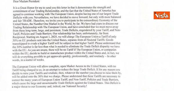 (Agenzia Vista) Roma, 12 luglio 2025 IL Presidente degli Stati Uniti ha pubblicato su Truth la sua lettera indirizzata alla presidente della Commissione europea, Ursula von der Leyen, in cui annuncia l'introduzione dal primo agosto di dazi al 30% sulle merci in arrivo dall'Unione europea dal Primo agosto. Truth Fonte: Agenzia Vista / Alexander Jakhnagiev