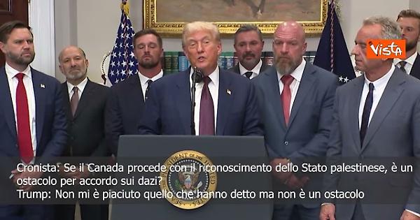 (Agenzia Vista) Washington, 31 luglio 2025 “Non mi è piaciuto quello che hanno detto, ma questa è la loro opinione. Non è un ostacolo, ma per ora non abbiamo parlato ancora con il Canada.” Così il Presidente degli Stati Uniti Donald Trump, sulla decisione del Canada di riconoscere lo Stato di Palestina. Courtesy: The White House Fonte: Agenzia Vista / Alexander Jakhnagiev