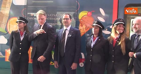 Si è tenuta a Roma, presso la Stazione Ostiense, la cerimonia di inaugurazione della nuova livrea del treno Leonardo Express dedicata alla candidatura della cucina italiana a Patrimonio Culturale Immateriale dell’Unesco. Presenti all'inaugurazione il Ministro dell'Agricoltura Francesco Lollobrigida e il presidente di Ferrovie dello Stato Tommaso Tanzilli. "La cucina italiana rappresenta la nostra storia e la nostra cultura - ha detto il ministro - per questo la candidiamo". "Ferrovie dello Stato - ha detto Tanzilli - sostiene la candidatura".