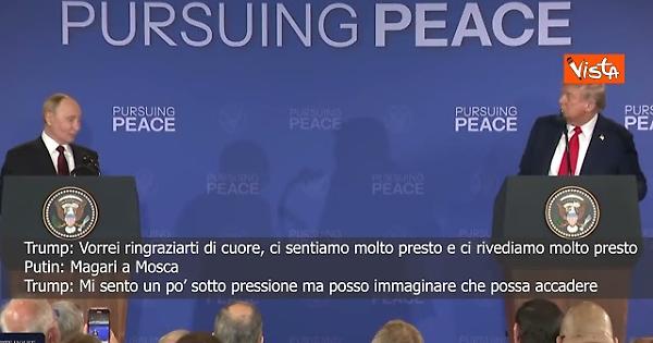 Scambio di battute tra il Presidente degli Stati Uniti Donadl Trump e Il Presidente russo Vladimir Zelensky al termine della conferenza stampa a conclusione del loro incontro sulla guerra russo-ucraina. Il leader americano ha infatti chiuso promettendo un secondo incontro a breve con quello russo, che ha risposto in inglese: In Russia. Trump a sua volta ha replicato: “Potrei immaginare che possa succedere”.