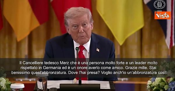 “Stai bene con quell’abbronzatura, dove l’hai presa? La vorrei anche io come la tua”, così Donald Trump scherza con il Cancelliere tedesco Merz durante l'incontro sulla guerra in Ucraina alla Casa Bianca con Zelensky e i leader Ue.