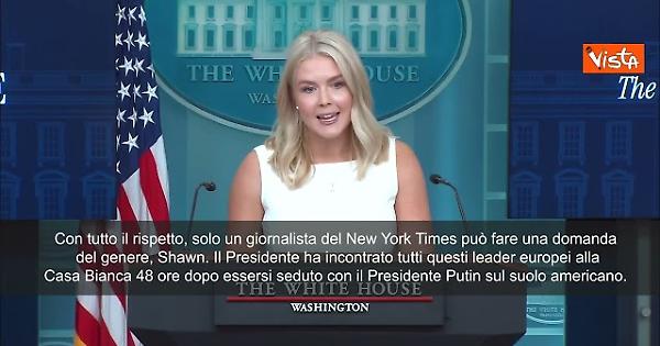 "Se il punto è portare tutti sulla stessa lunghezza d’onda, perché Trump non dovrebbe semplicemente rispondere alla chiamata di Putin mentre gli altri leader erano alla Casa Bianca? Perché sarebbe irrispettoso farlo? Con tutto il rispetto, solo un giornalista del New York Times può fare una domanda del genere, Shawn. Il Presidente ha incontrato tutti questi leader europei alla Casa Bianca 48 ore dopo essersi seduto con il Presidente Putin sul suolo americano. In effetti, ci sono stati così tanti progressi che ognuno di questi leader è salito su un aereo 48 ore dopo ed è volato qui. Lo stesso presidente Zelensky ha detto che è stata un'ottima conversazione. È stato solo grazie al Presidente Trump che questa situazione di stallo è stata superata avviando un dialogo con il presidente Putin. Quindi questi leader, con la guerra nel proprio cortile, sono molto grati che il Presidente abbia risposto a quella chiamata", così la Portavoce della Casa Bianca Karoline Leavitt replica alla domanda del giornalista del Nyt Shawn McCreesh, che ha chiesto perché Donald Trump avesse telefonato in privato a Vladimir Putin mentre incontrava i leader europei e il Presidente ucraino Zelensky alla Casa Bianca.
