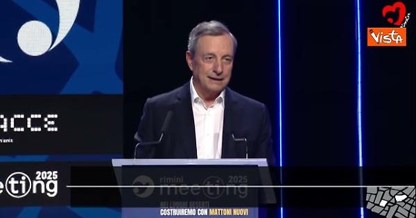 L'ex premier Draghi interviene sul palco del Meeting di Rimini. Accolto da un lungo applauso del pubblico, Draghi non indossa la cravatta.