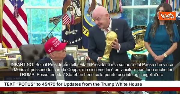 Il Presidente della Fifa, Gianni Infantino, ha portato la coppa alla conferenza stampa nello Studio Ovale della Casa Bianca in cui è stato annunciato che il sorteggio dei Mondiali avverrà il 5 dicembre al Kennedy Center di Washington. Infantino ha spiegato: "Solo i presidenti della Fif, i capi di Stato e i vincitori possono toccarlo, perché è riservato esclusivamente ai vincitori.” Poi ha aggiunto, rivolgendosi a Trump: “E siccome Lei è un vincente, naturalmente può tenerla anche Lei”. Il Presidente Usa ha quindi preso in mano il trofeo e ha commentato: “È piuttosto pesante", poi ha aggiunto scherzando: "Posso tenerla? starebbe bene lì, tra gli angelo d'oro”.